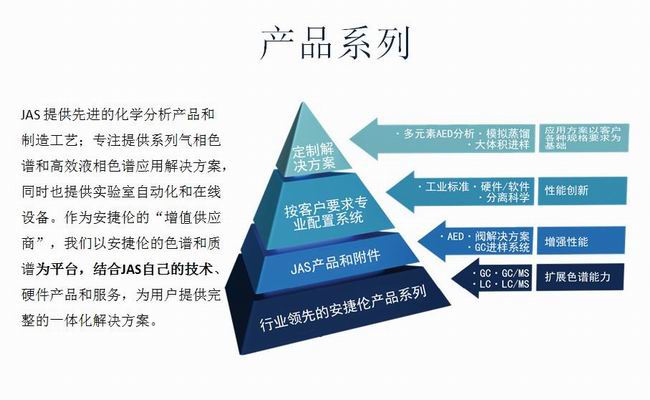 5542),在美国、新加坡和中国及印度设有分公司或子公司,2006年JAS总部入驻自建的面积达30,000平方英尺的厂房。自1995年成立以来,JAS致力于色谱和质谱相关产品的应用开发和系统集成解决方案。作为安捷伦的主要解决方案合作者,JAS根据用户的特殊需求,专注于为不同的群体设计、制造和提供独创交钥匙解决方案系统。